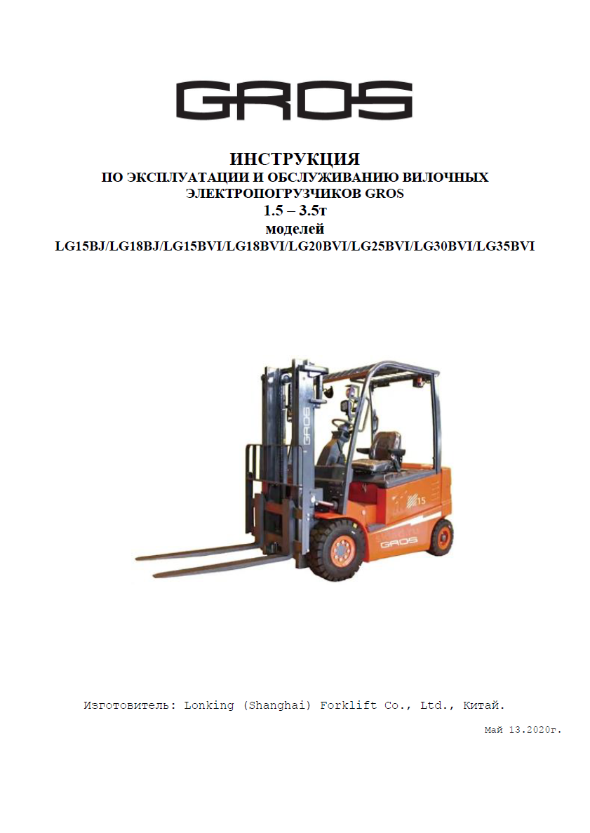Инструкция по эксплуатации и обслуживанию вилочных электропогрузчиков GROS 1.5 – 3.5т моделей LG15BJ/LG18BJ/LG15BVI/LG18BVI/LG20BVI/LG25BVI/LG30BVI/LG35BVI