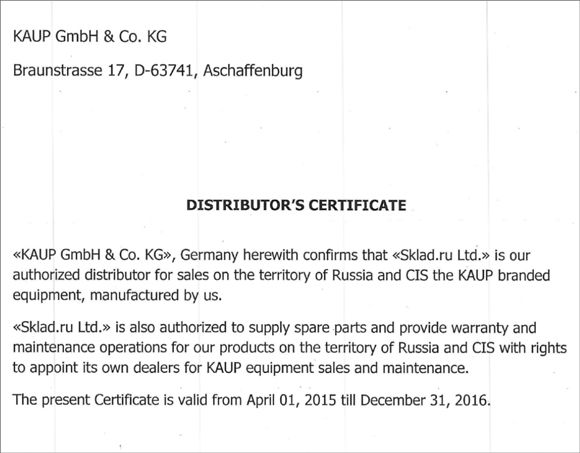 Наша компания также уполномочена поставлять запчасти проводить гарантийное послегарантийное обслуживание продукции KAUP на территории России и СНГ с правом назначать дилеров по продажам и обслуживанию.